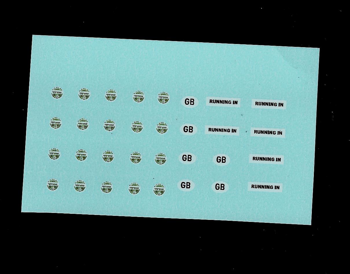 Set of waterslide transfers taken from scans of Corgi 1460 Self Adhesive Accessories Pack A. This sheet is the road fund licences, GB plates and running in labels in set 1460.