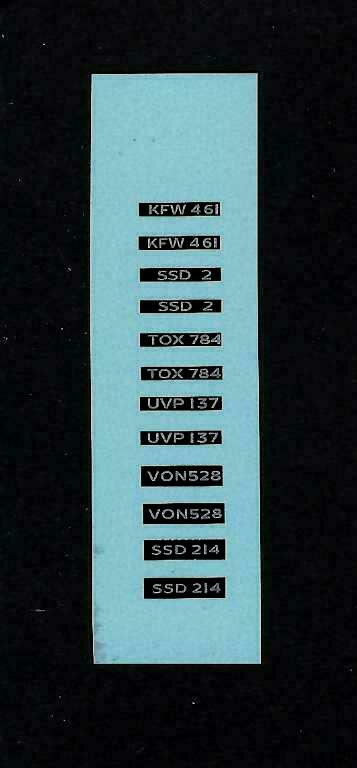 Set of waterslide transfers taken from scans of Corgi 1461 Self Adhesive Accessories Pack B. This sheet is the number plates in set 1461.