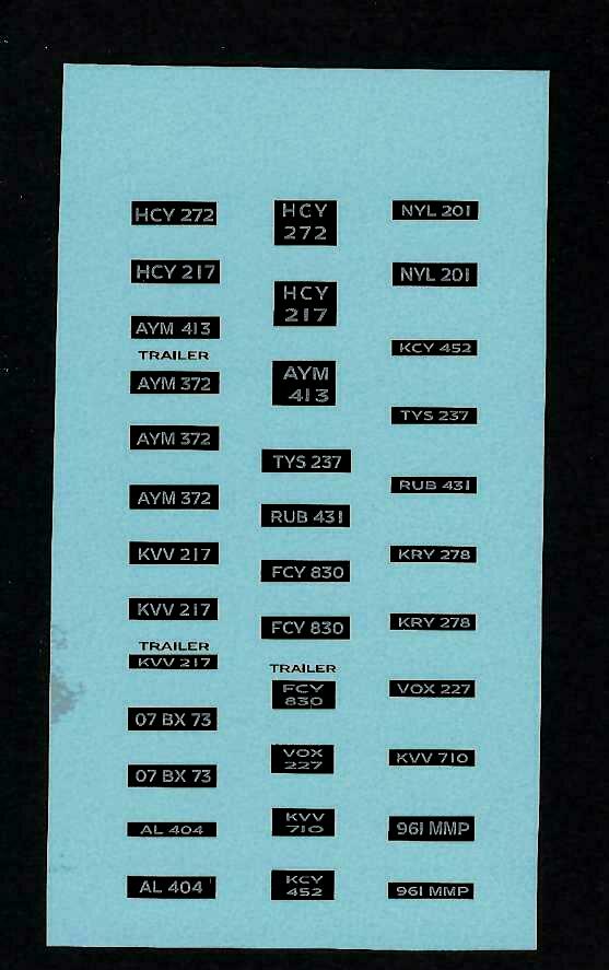 Set of waterslide transfers taken from scans of Corgi 1462 Self Adhesive Accessories Pack C. This sheet is the number plates in set 1462.
