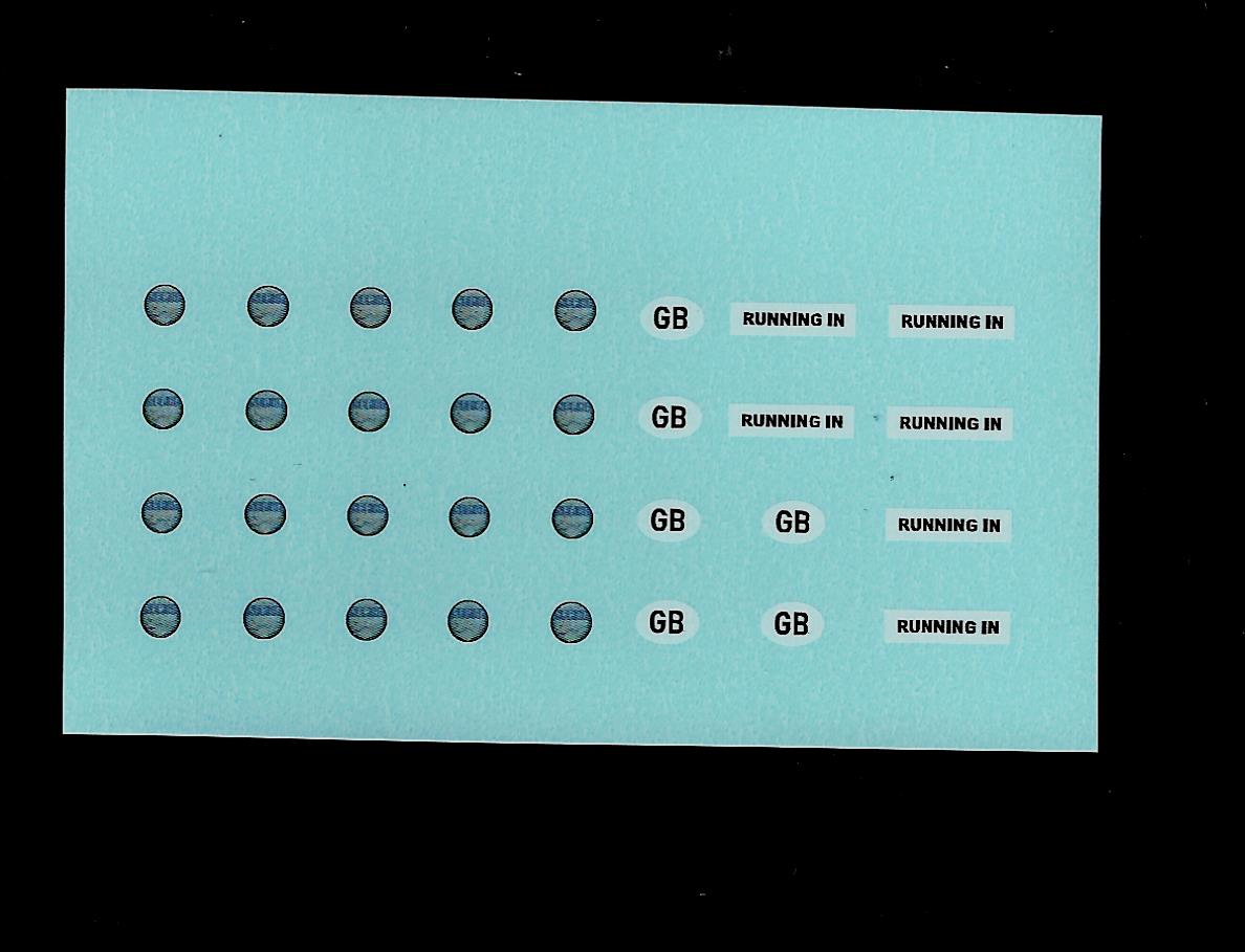 Set of waterslide transfers taken from scans of Corgi 1464 Self Adhesive Accessories Pack E. This sheet is the road fund licences, GB plates and running in labels  in set 1464.