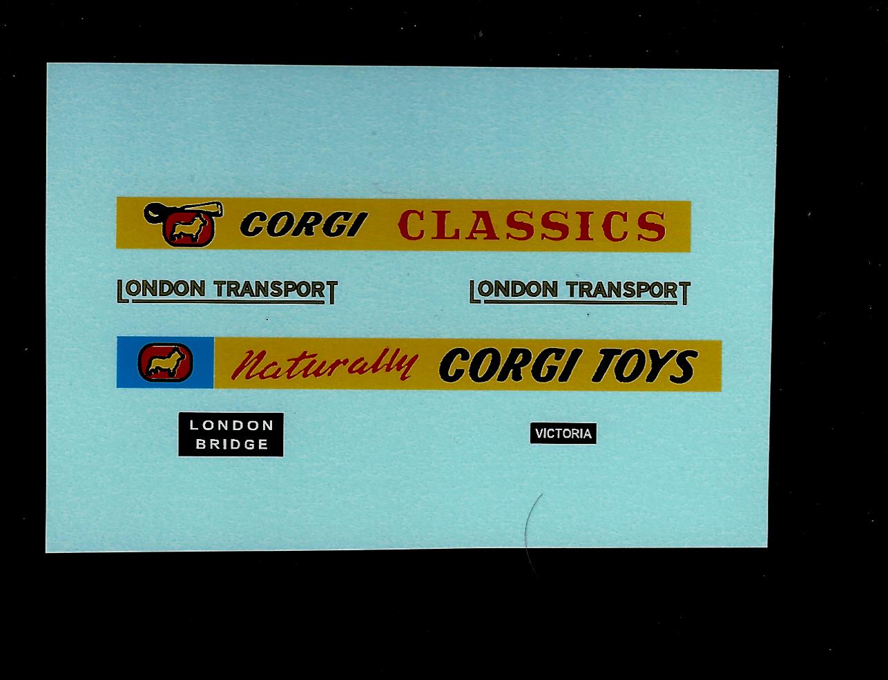 Set of replacement transfers for Corgi model 468 Routemaster Bus. Note, these transfers are designed for model 468, the first smaller casting of this bus.