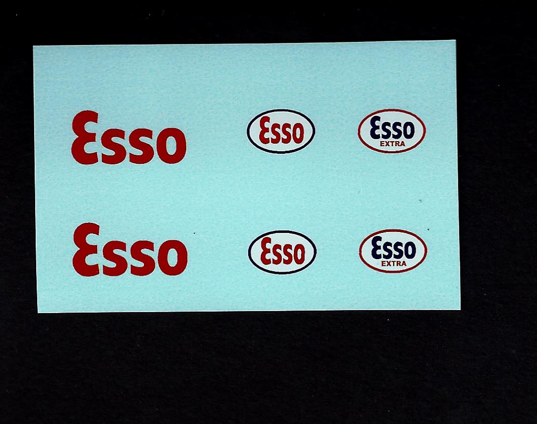 The large Esso transfers are designed to be placed on the white background of the main sign and measure approximately 20mm x 9mm. The smaller transfers are approximately 11mm x 7mm.